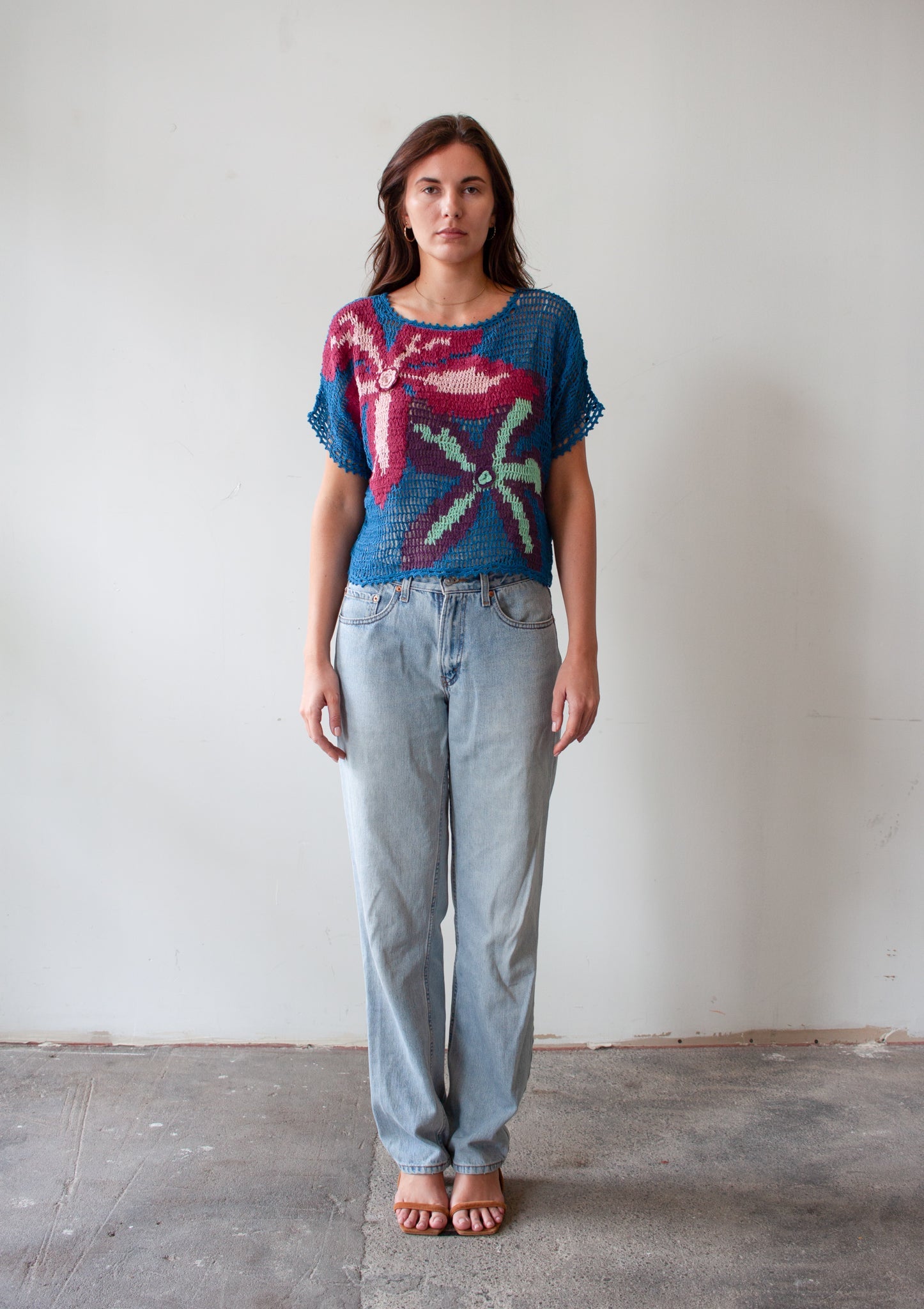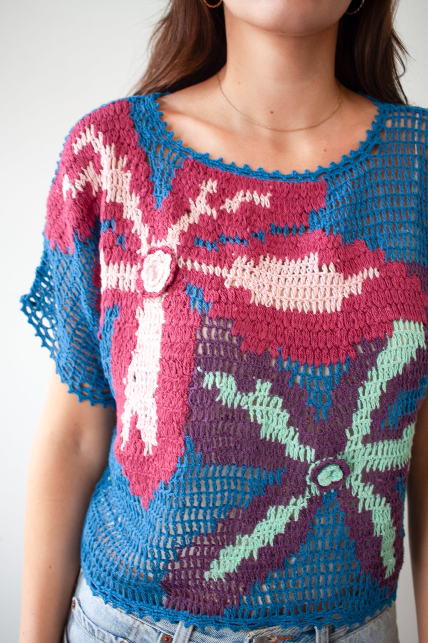 Introducing Yeva. Hand crocheted with floral accents for a one-of-a-kind top that’s perfect for layering.
