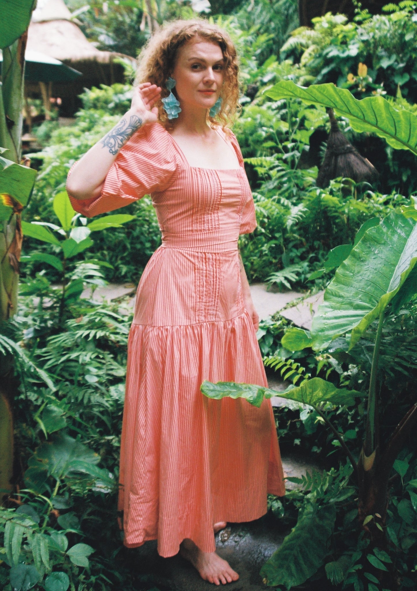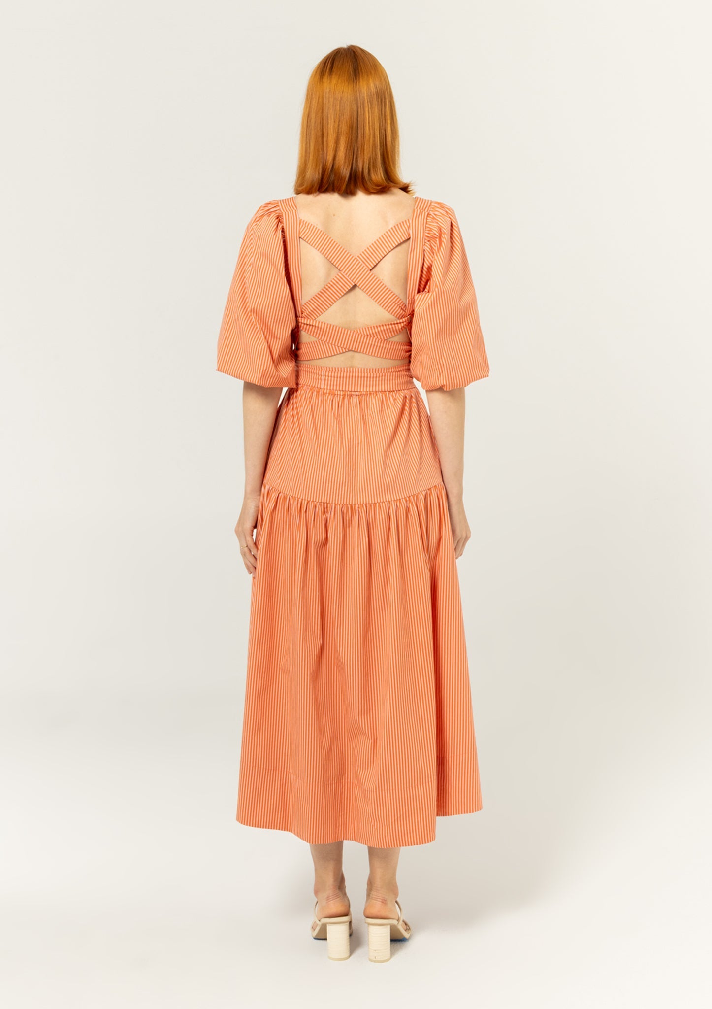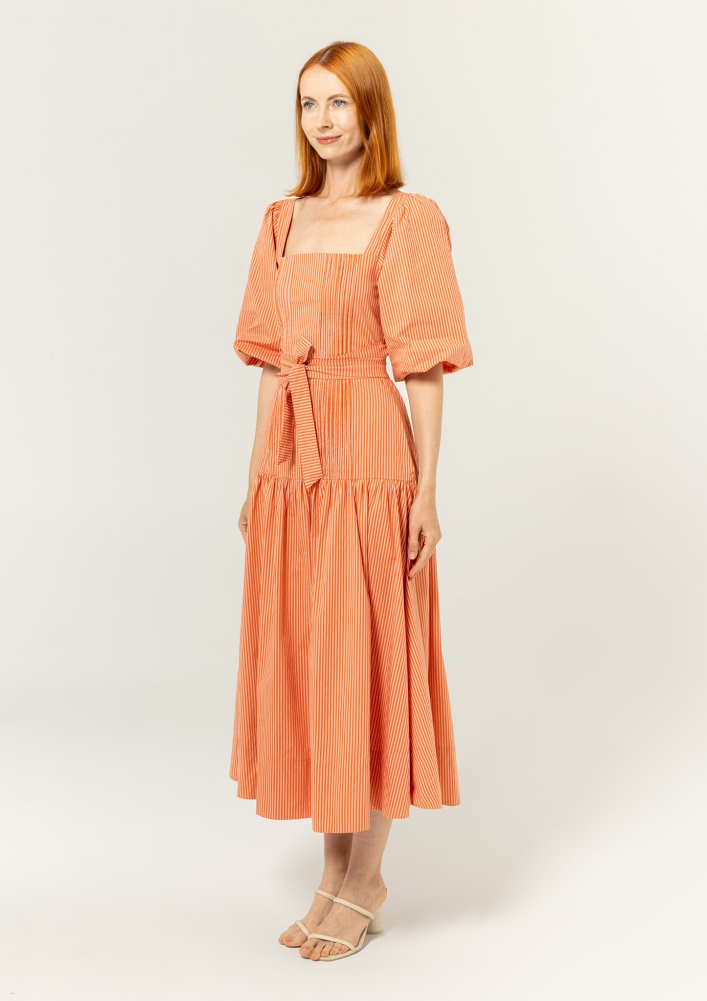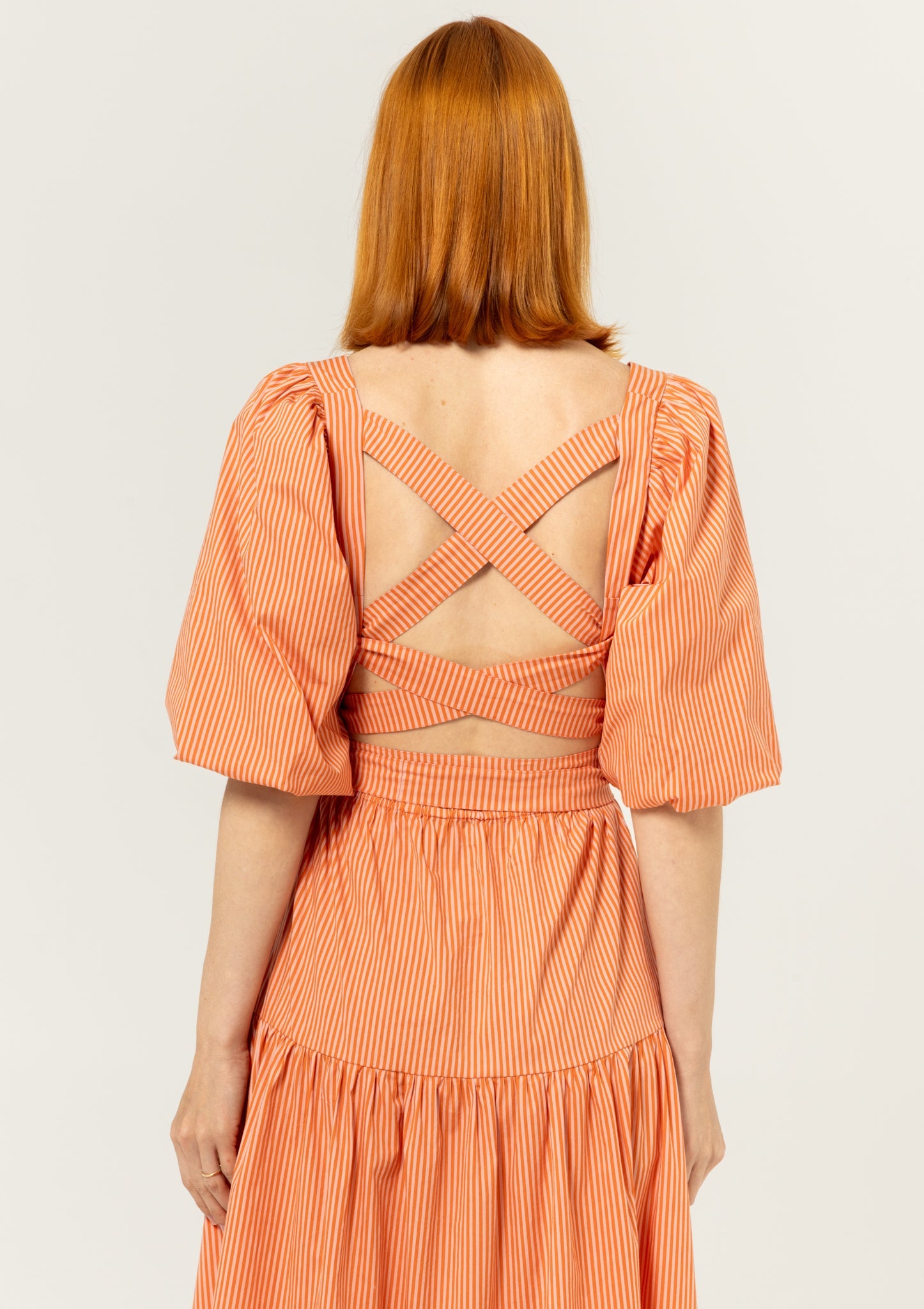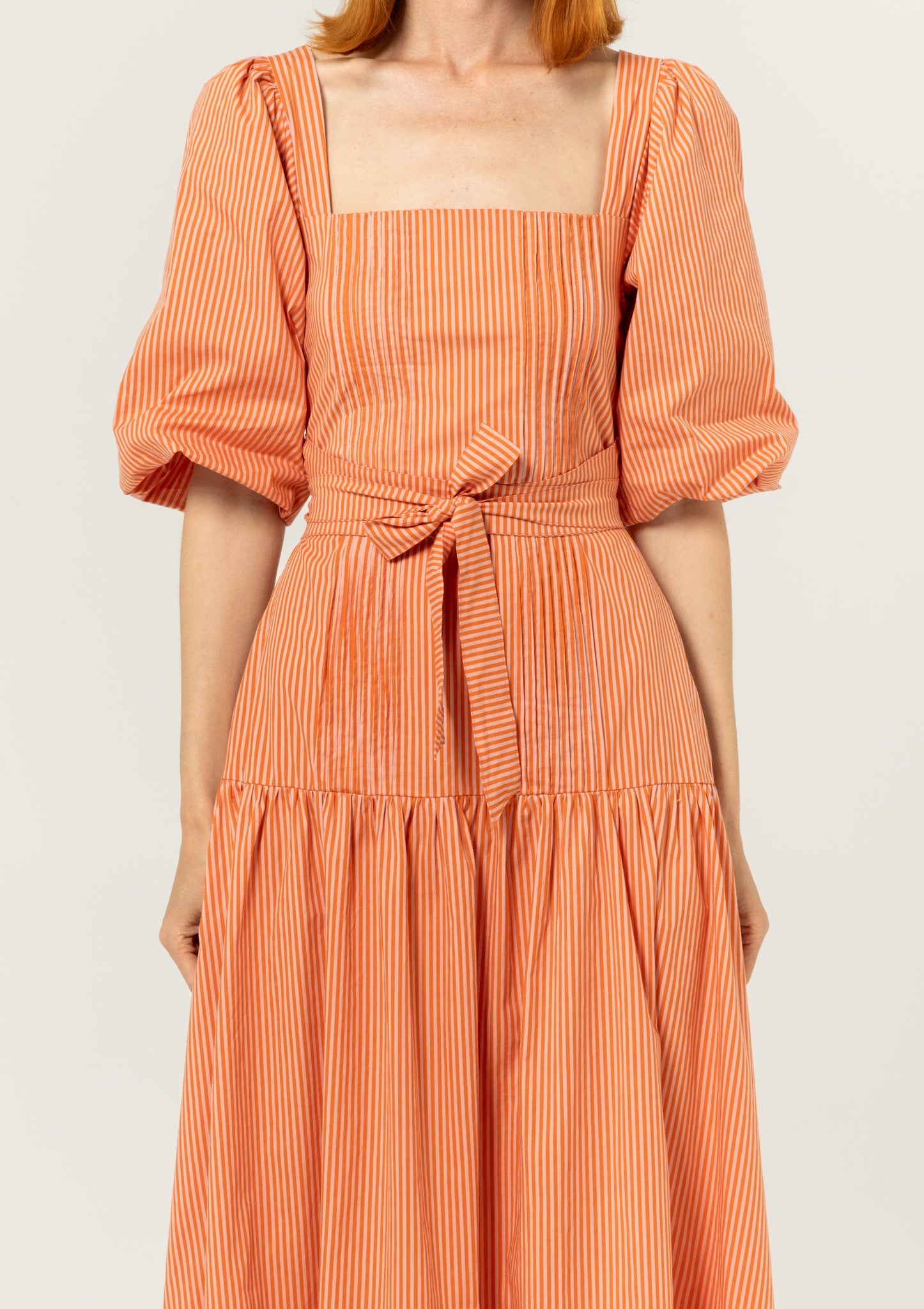 Emilia does it all. A charming square neckline meets romantic puff sleeves, while a wrap-tie waist and a crossover back embody the beauty of simple femininity.