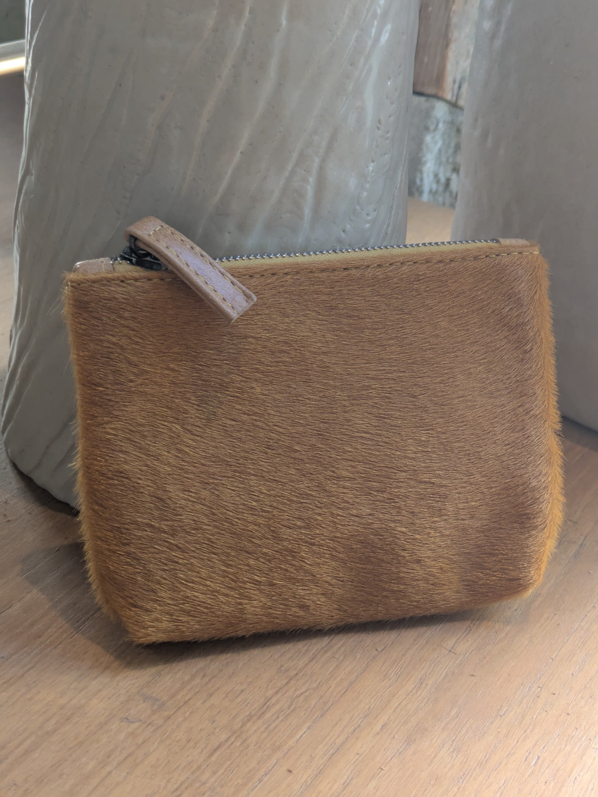 A little leather pouch! Metal zipper in an antique nickel finish. The leather is a cow hair.