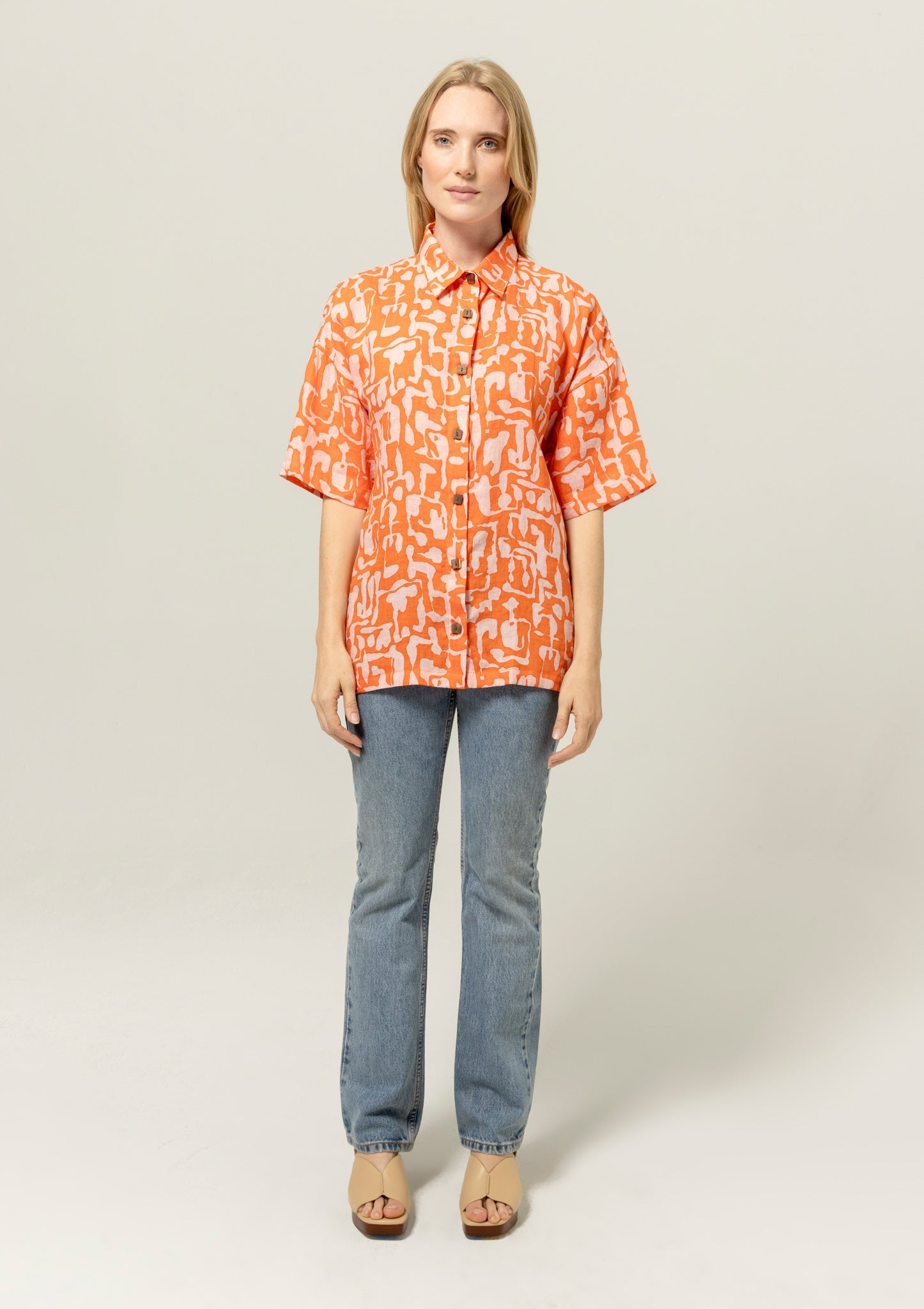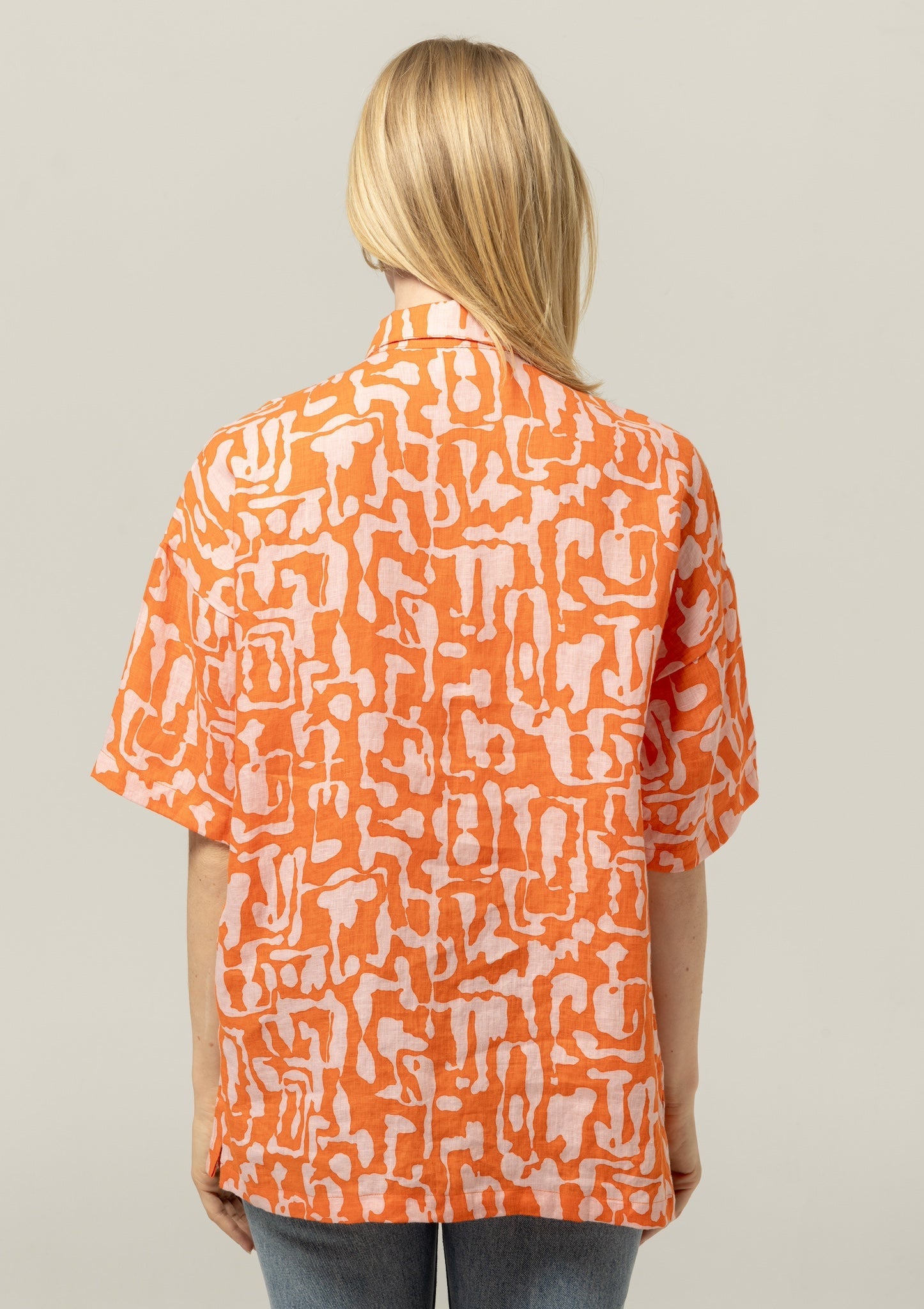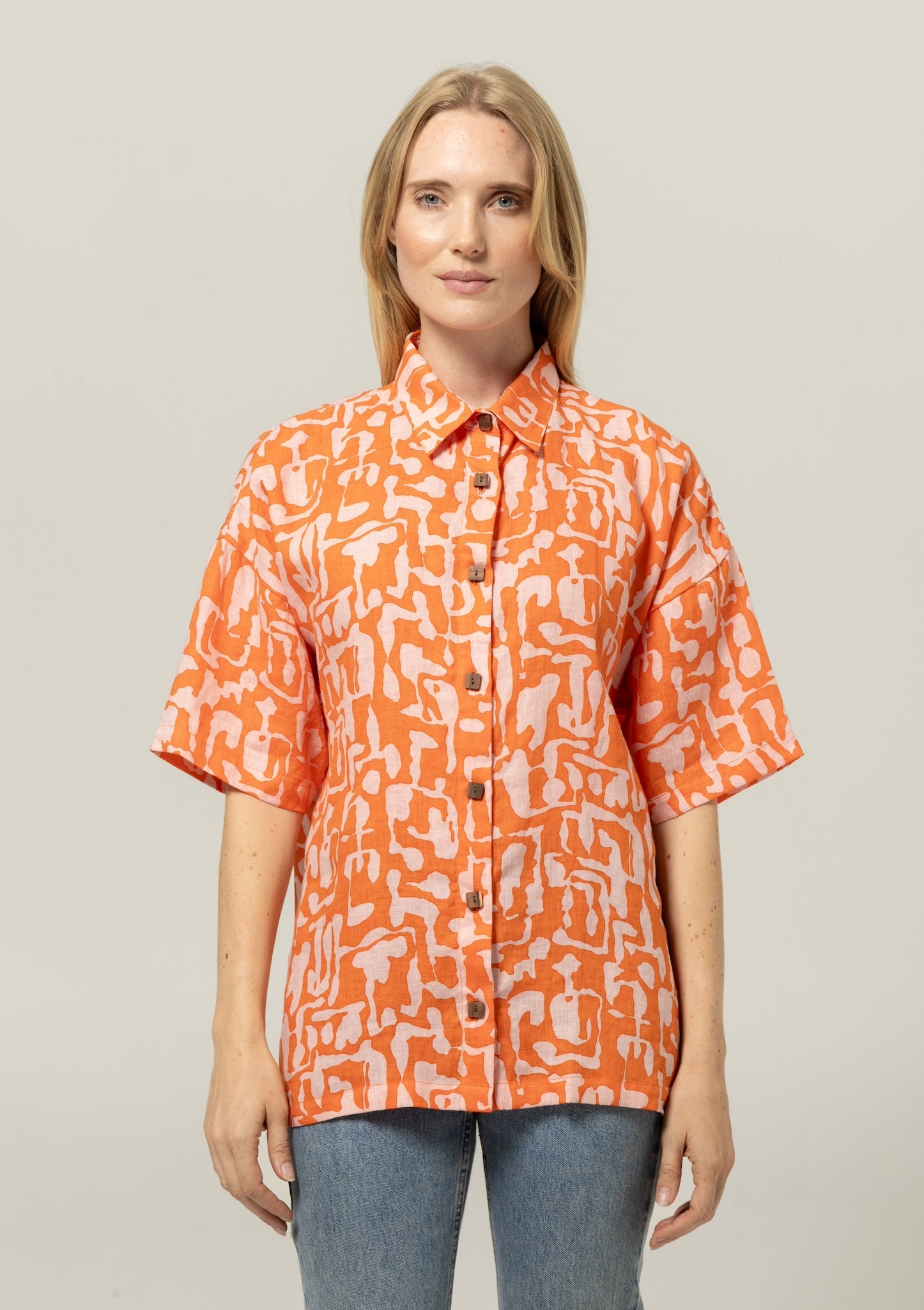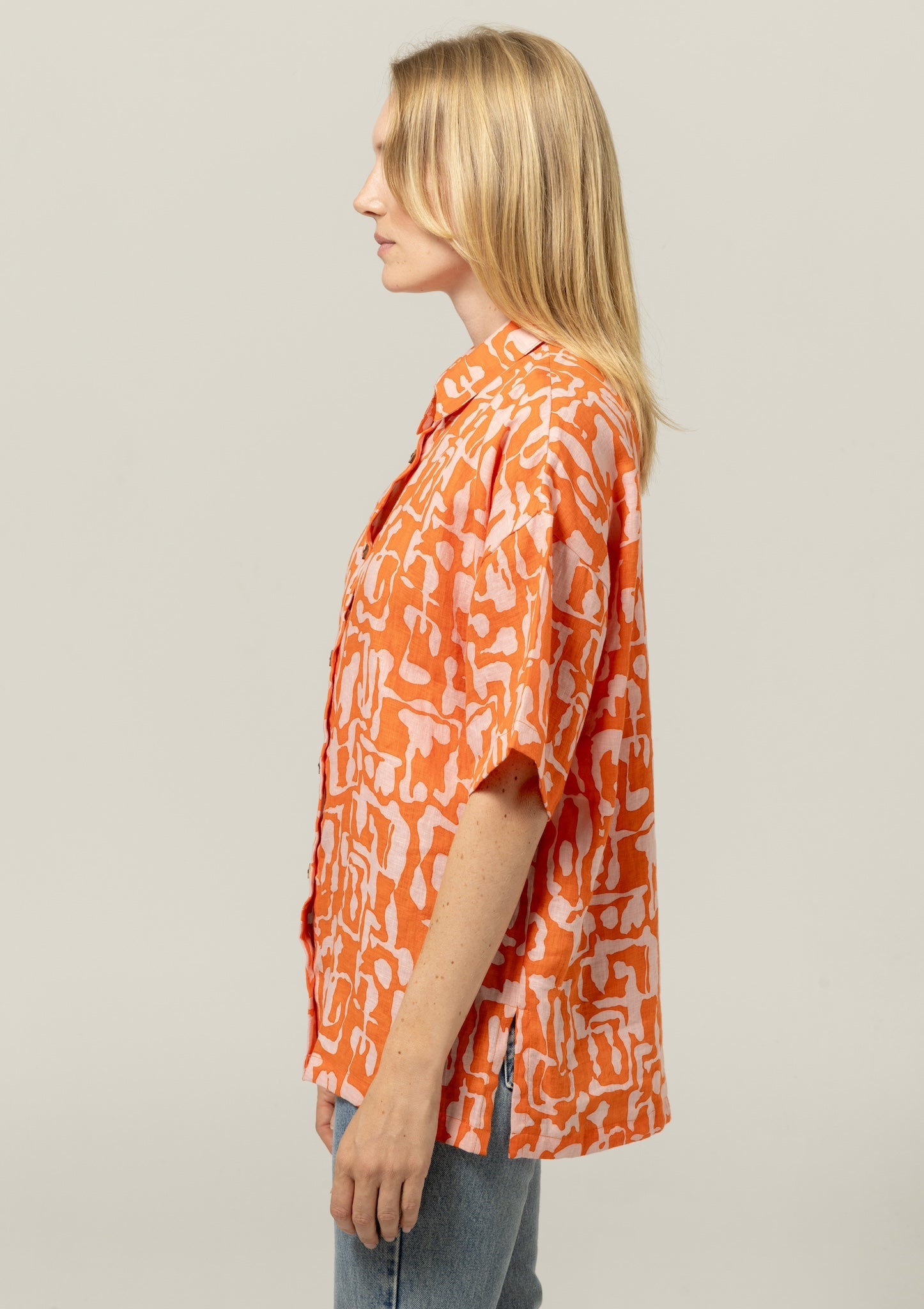 Linen meets vibrant handprinted colorways in this lightweight button-up top with delicate ruching. Lounge at home or take it for a stroll.