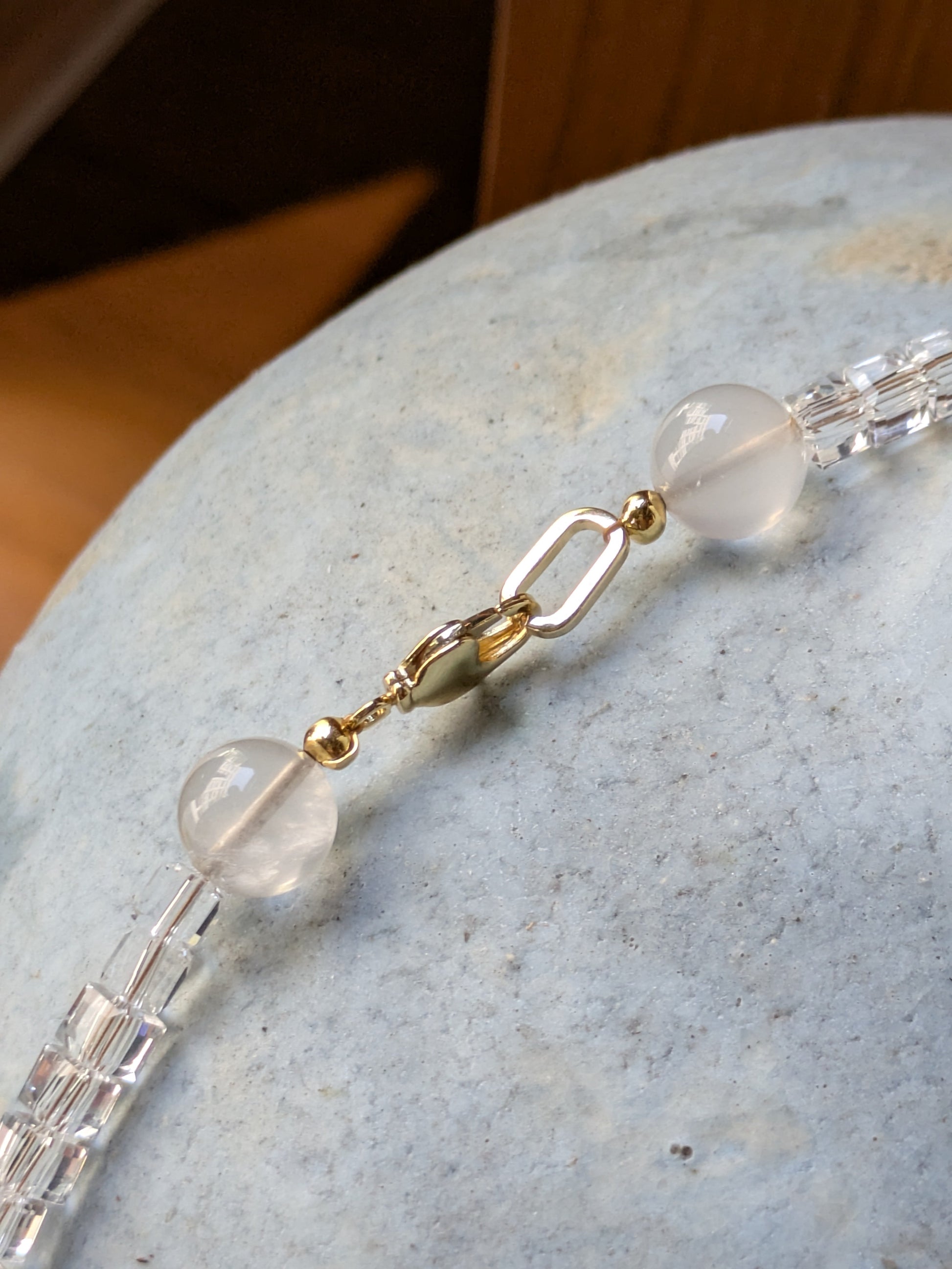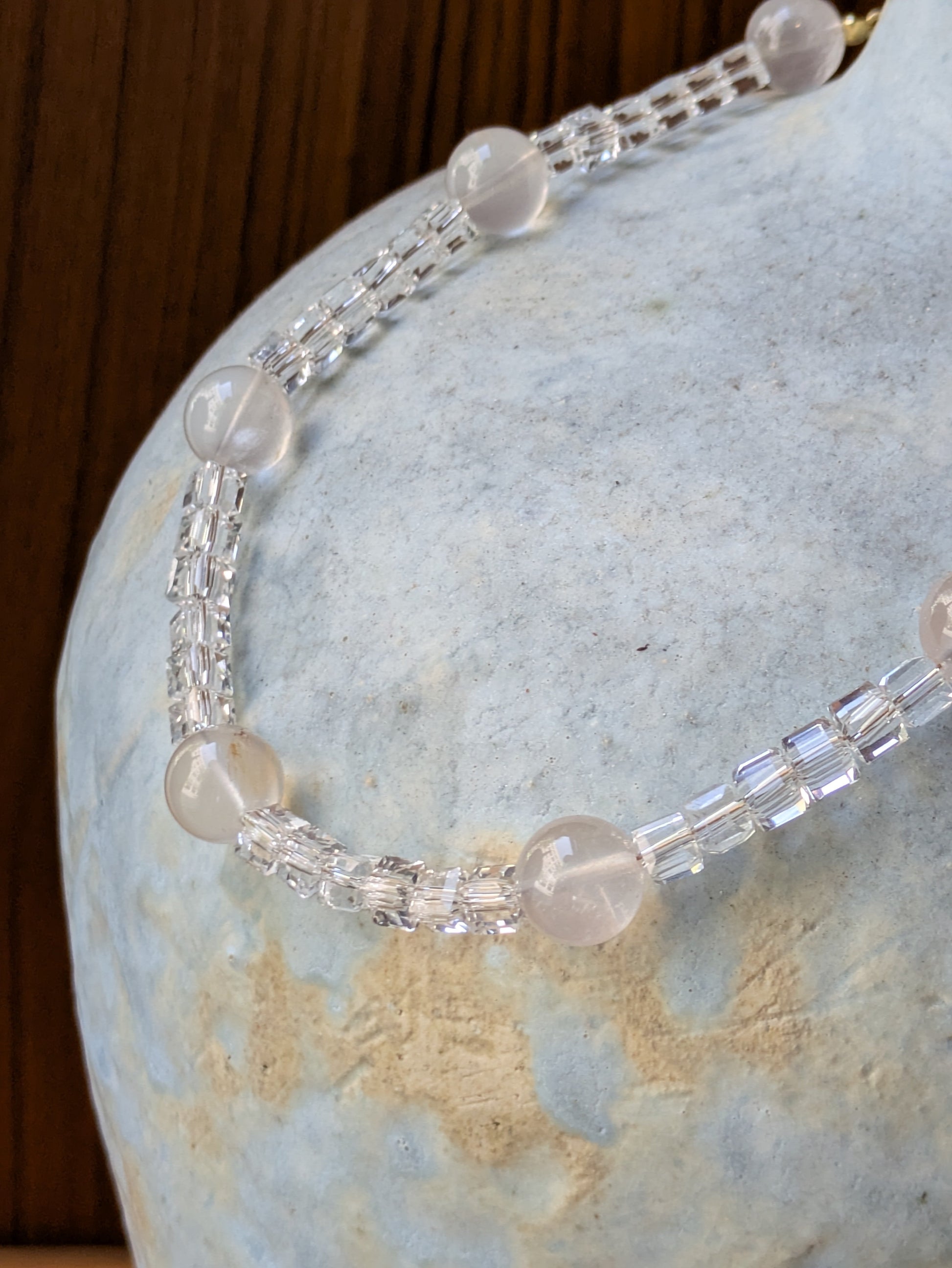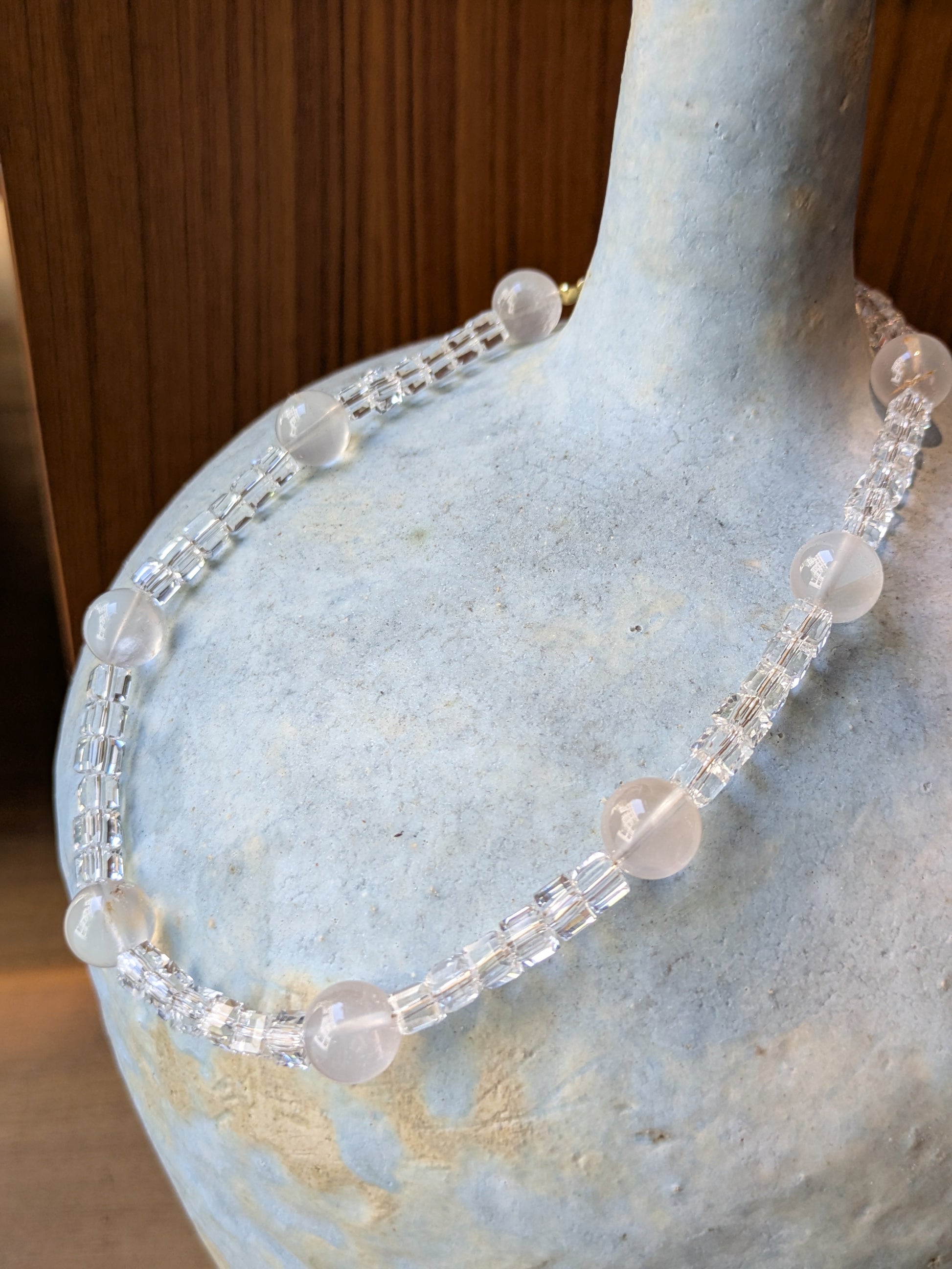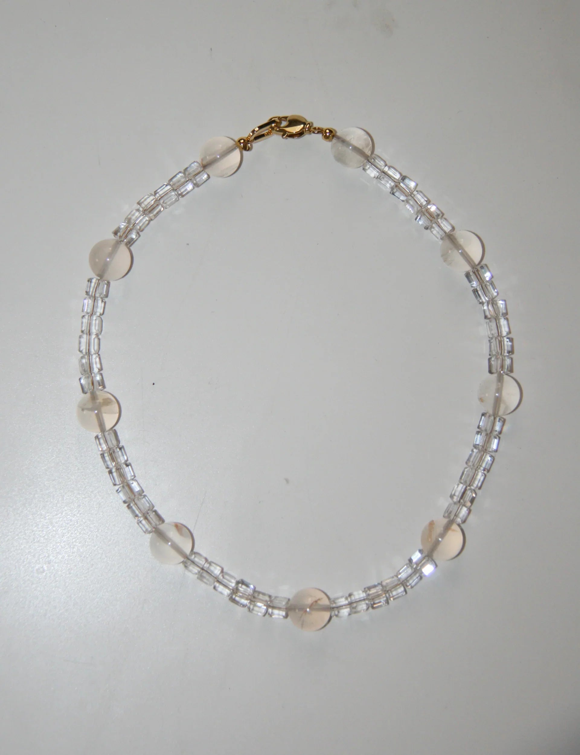 Featuring a monochromatic design, this beaded necklace exudes an alluring luminescence. Its faceted cubed Czech glass beads are adorned with evenly spaced round rutilated quartz, making for a subtle yet eye-catching strand.