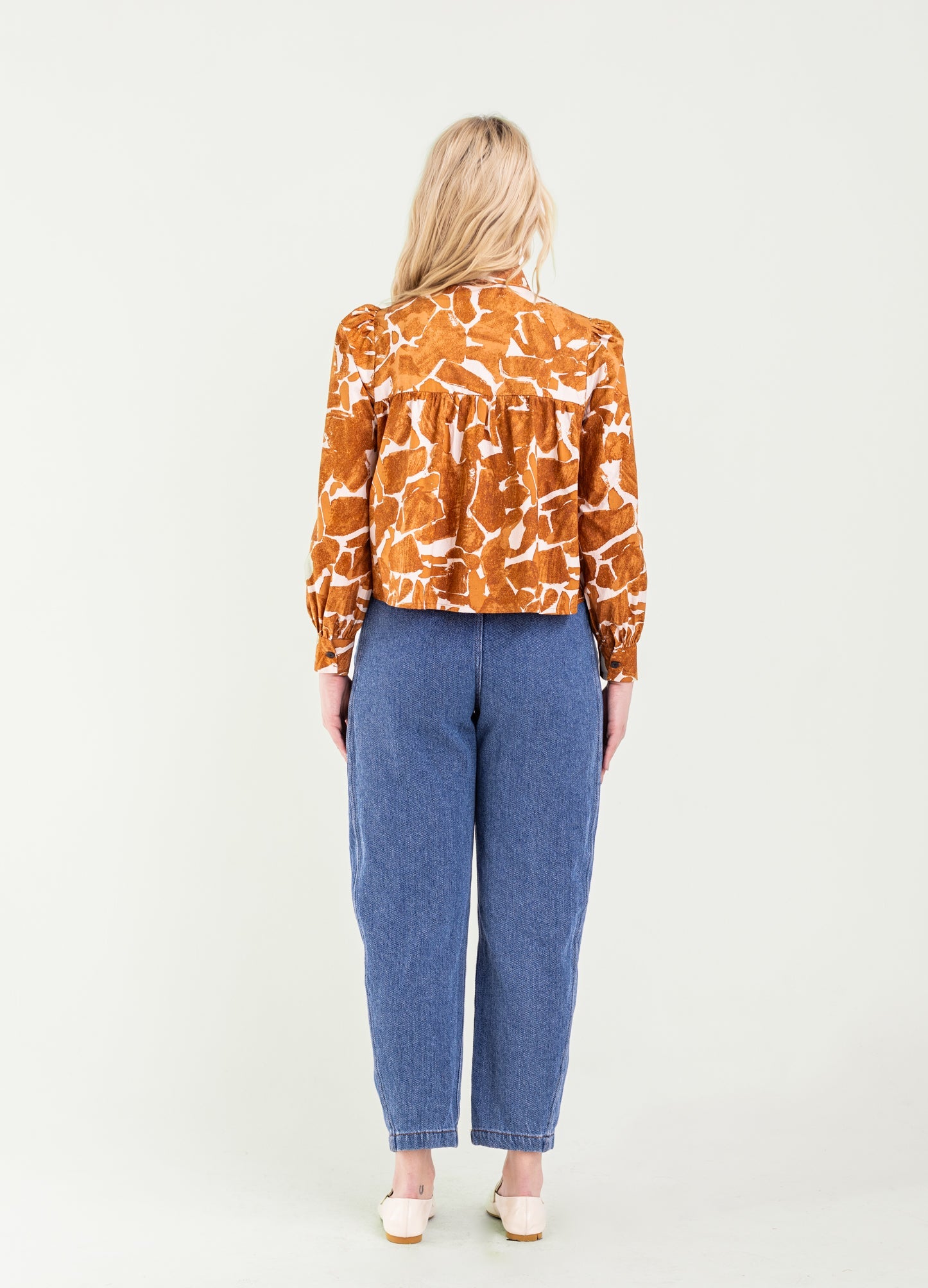 With a men’s polo collar, Raven is reinvented with buttons in the front and delicate seam detailing for a sweet and feminine edge. Full-length sleeves gather at the shoulders and the cuffs.