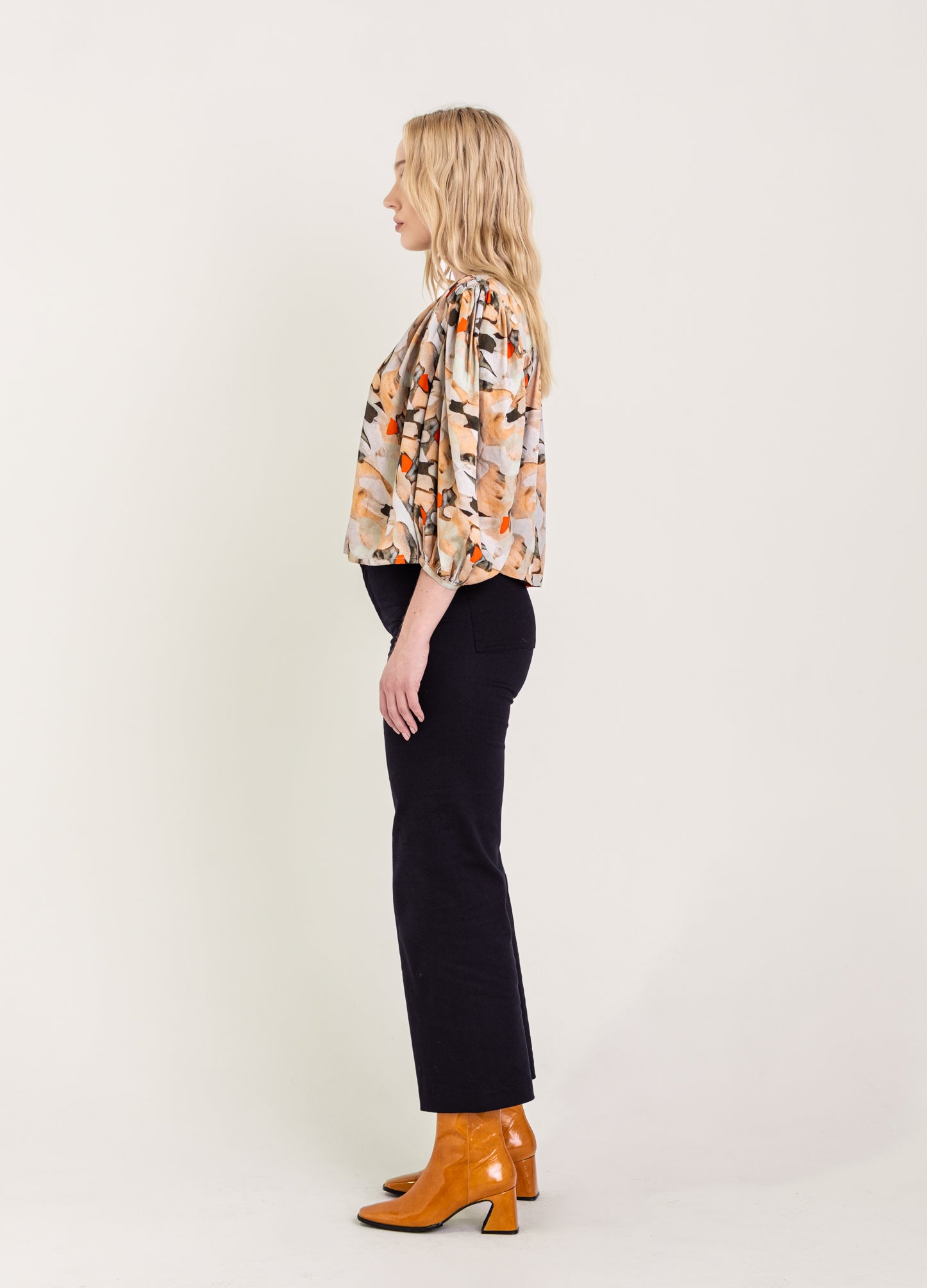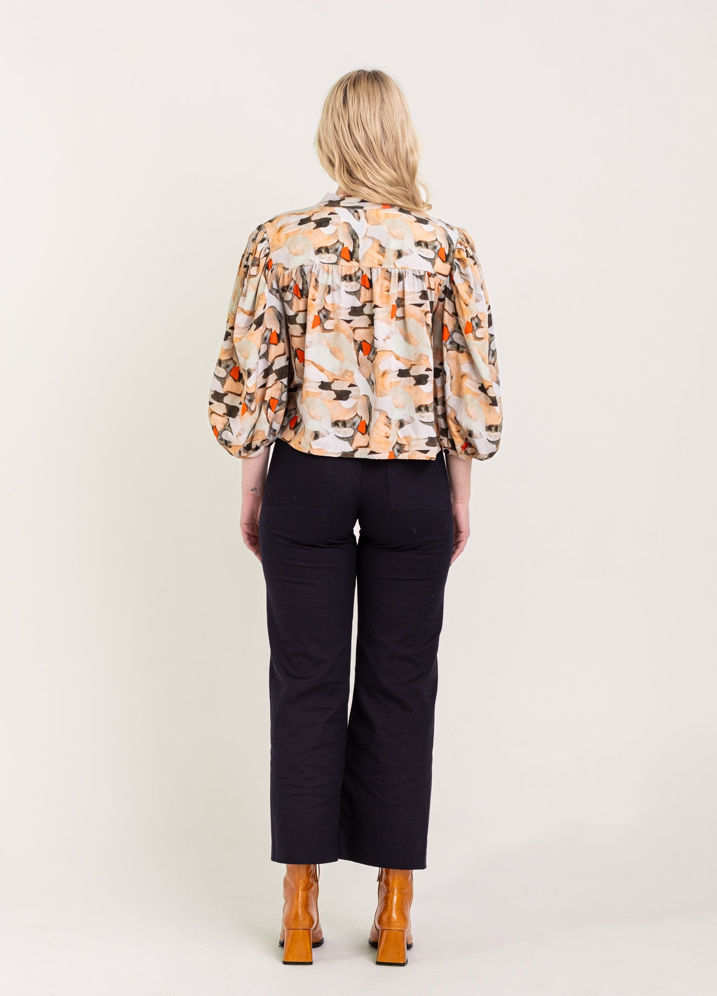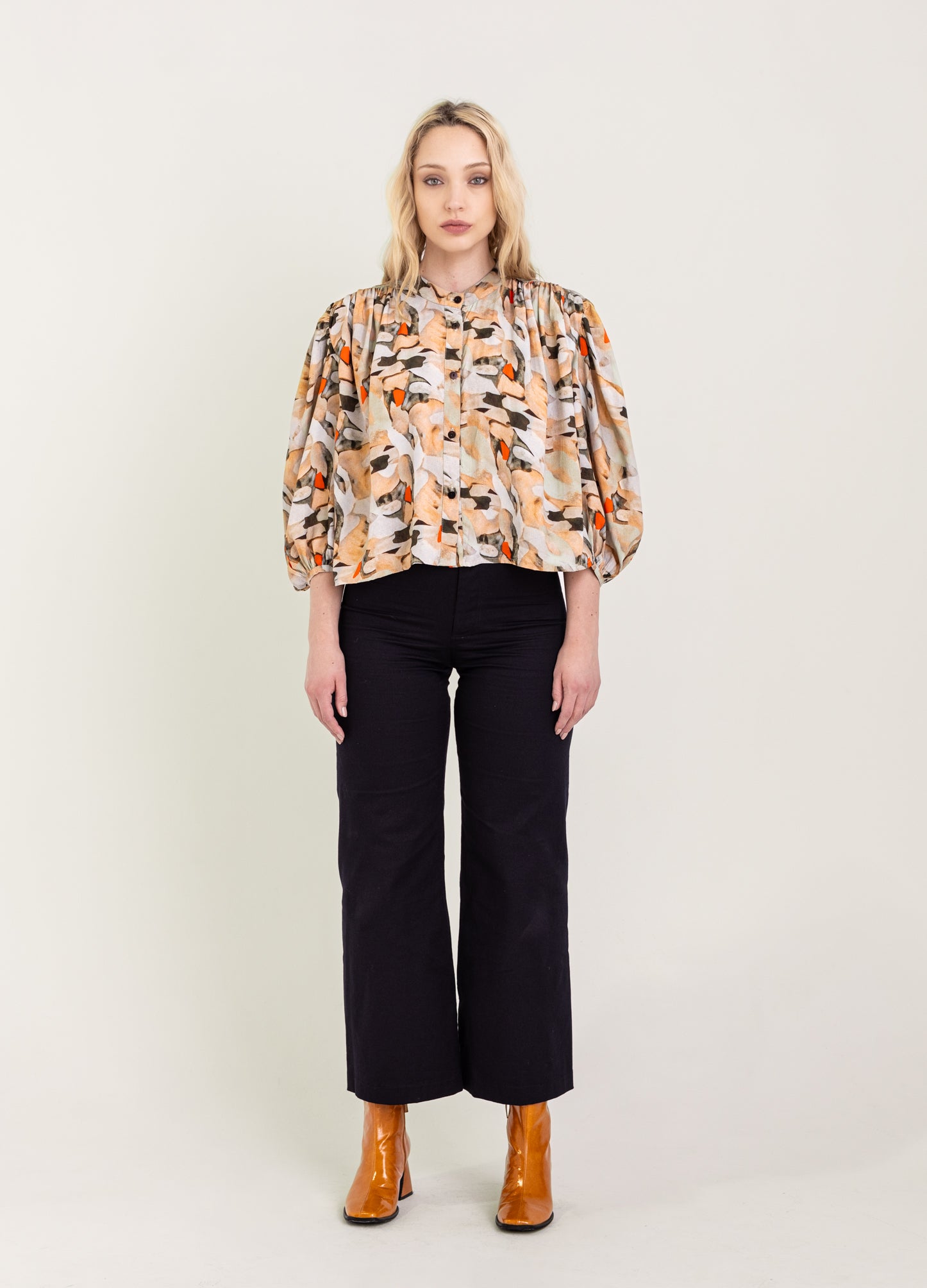 Tabitha is free-spirited and free flowing with gently pleated shoulders, mid-length puff sleeves, and buttons in the front. A perfect crop top with a boxier look that pairs great with high waisted jeans and a leather tote.